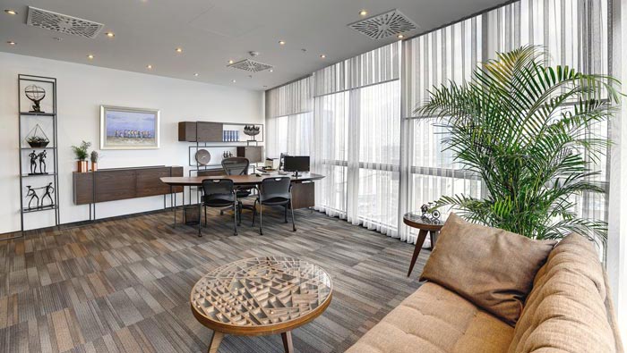 老總辦公室設計:此處給人的第一感覺仿佛在天邊一樣,落地窗外面空無一物,給人一種俯視大地的感覺,車就像是螞蟻一樣、擁擠的人群也盡收眼底,對于人視野、格局都會有所裨益。