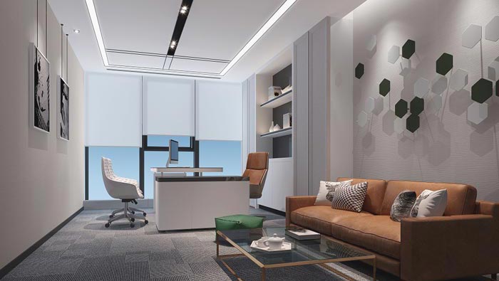 老總辦公室設計:此處給人的第一感覺就是明亮、通透,在設計中設計師采用多重弱化的手法,將光進行多次重疊,進入室內后剩下的是柔柔的柔光,讓人感到溫暖與舒適。