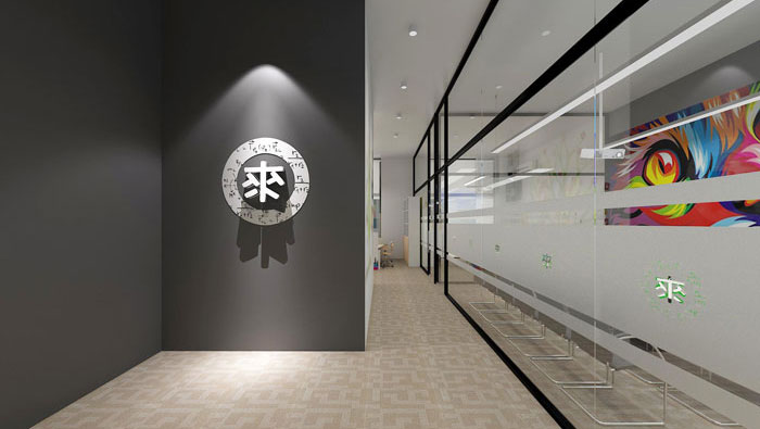550平方科技辦公室前臺:在本次設計中,設計師在深入的了解建筑本身的條件之后,最后根據企業的屬性對空間進行取舍,在此空間中前臺已經不適合了,所以設計師將前臺空間舍棄掉,以簡單、明了的設計手法對空間進行設計,將企業的形象與品牌得到充分的展示。