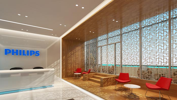 1000平方無人機公司辦公樓前臺:在本次設計中,設計師充分考慮到室外的景觀與室內的設計相配合,由于空間本身的特點,室內與室外的融合非常重要,不然會出現不倫不類的想象,設計師在思考之后最后以自然的顏色對前臺進行設計,這樣的設計對于室外、室內來說,均是相互契合。