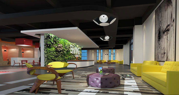 1500平方創意工廠辦公室前臺:在設計的時候,設計師采用公園式對空間進行設計,一方面這樣的空間不僅可以做前臺之用,同時還可以兼顧洽談、散步、休息、接待之用,設計師希望空間的作用可以發揮到極致。